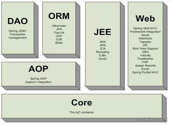 **** spring的基本框架主要包含六大模块:DAO、ORM、AOP、JEE、WEB、CORE