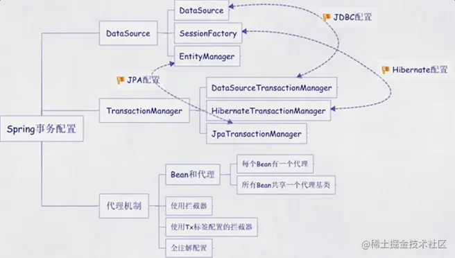 Spring使用AOP配置事务管理由三个部分组成,分别是DataSource、TransactionManager和代理机制这三部分,无论哪种配置方式,一般变化的只是代理机制这部分。DataSource、TransactionManager这两部分只是会根据数据访问方式有所变化,比如使用hibernate进行数据访问时,DataSource实际为SessionFactory,TransactionManager的实现为HibernateTransactionManager。