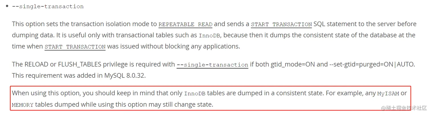 mysqldump --single-transaction获取一致性备份只适用于 InnoDB 引擎,对于 InnoDB 引擎表的备份,获取的是 T1 时刻的快照,对于非 InnoDB 引擎表的备份,获取的是当前最新数据。