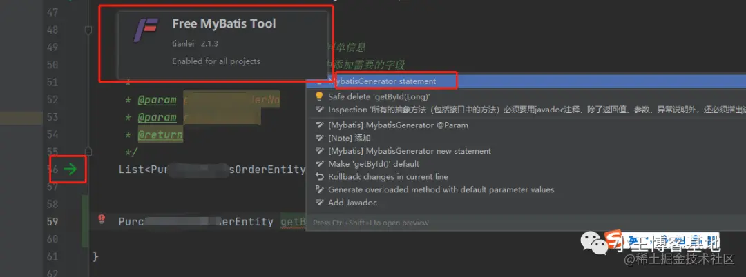 Free MyBatis Tool 是一款增强idea对mybatis支持的插件,可以点击箭头实现来回跳转,Alt+Enter可以生成代码块,前提你得有mapper.xml文件了哈!