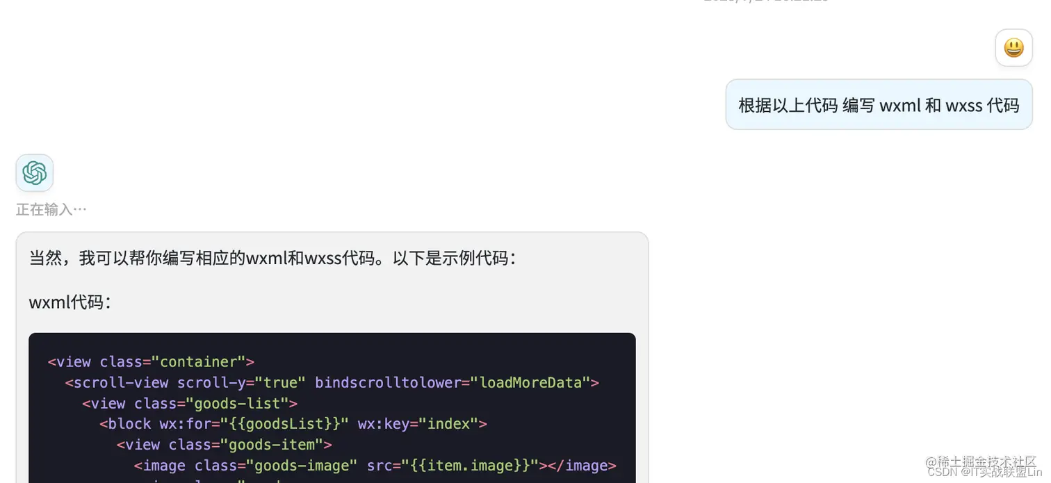我们让GPT继续帮我们编写 wxml 和 wxss 代码。