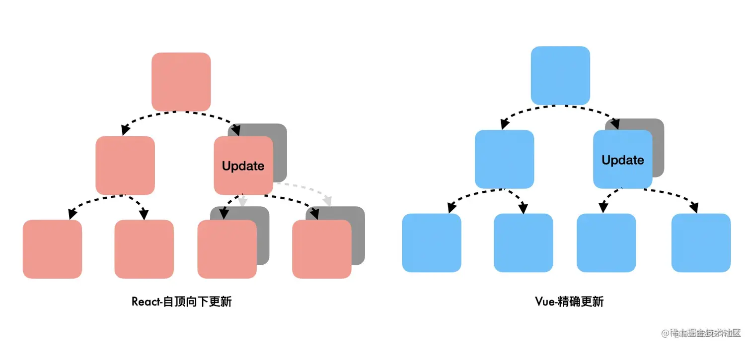 数据修改了,接下来要解决视图的更新:react中,调用setState方法后,会自顶向下重新渲染组件,自顶向下的含义是,该组件以及它的子组件全部需要渲染;而vue使用Object.defineProperty(vue@3迁移到了Proxy)对数据的设置(setter)和获取(getter)做了劫持,也就是说,vue能准确知道视图模版中哪一块用到了这个数据,并且在这个数据修改时,告诉这个视图,你需要重新渲染了。