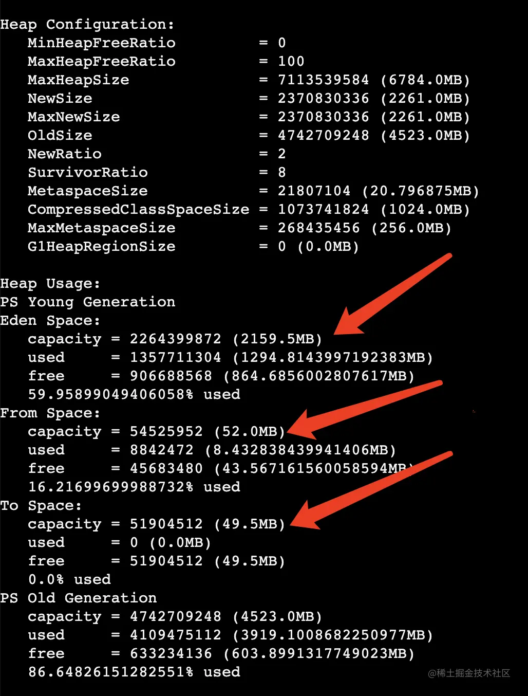 根据gc日志查看,活跃数据的大小为 2G 左右,年轻代空间为6G左右,老年代空间为10GB左右,所以大致判断,年轻代较小,导致一些对象快速晋升到老年代。