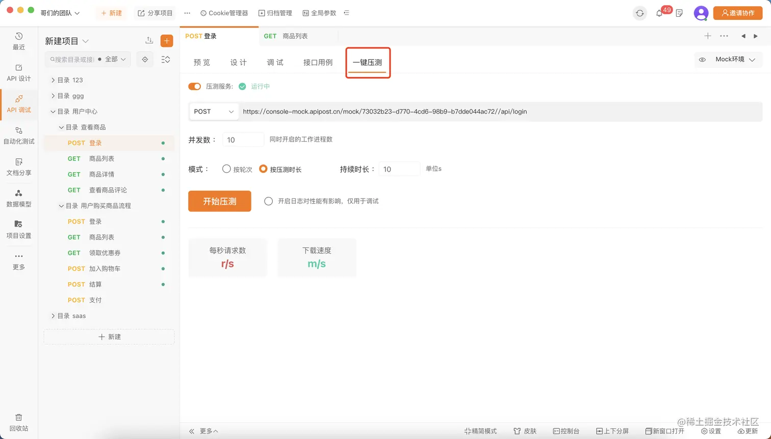 在Apipost中可以对接口进行并发测试,点击一键压测,输入并发数和时间/轮次,即可开始测试。