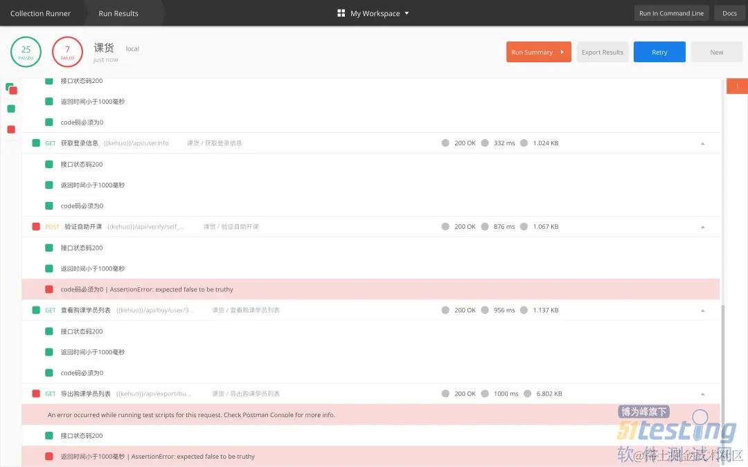 可以看到,我们测试了32个接口,其中25个通过,7个失败,有的是时间不满足要求,有的是状态码不对。