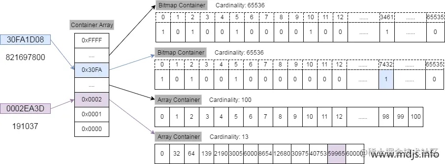 - 第二层称之为 Container(低 16 位),会依据数据分布进行创建(Container内的值实际是区间内的offset)