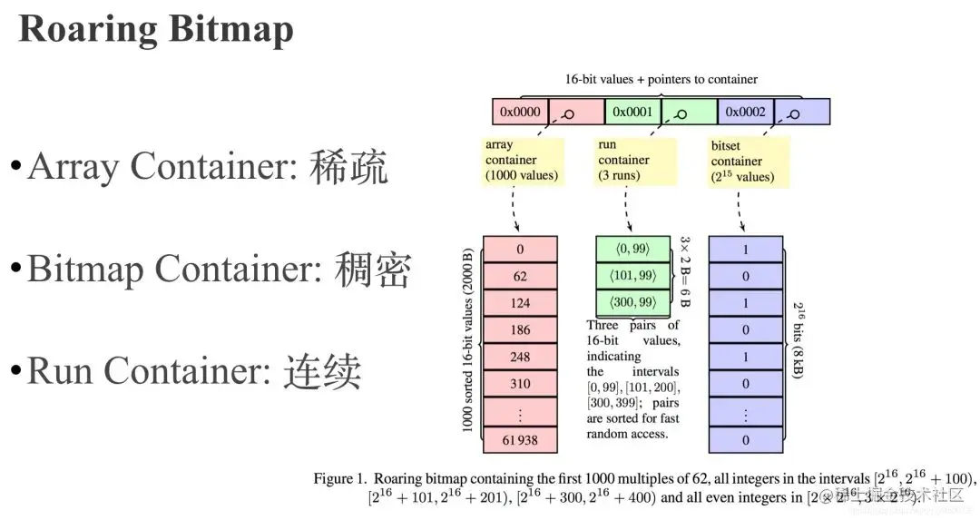 Array Container 存放稀疏的数据,Bitmap Container 存放稠密的数据。结合实现,若一个 Container 里面的 Integer 数量小于 4096,就用 Short 类型的有序数组来存储值。若大于 4096,就用 Bitmap 来存储值。Run Container是Bitmap的退化处理操作,压缩存储有一定连续值的数据存储。