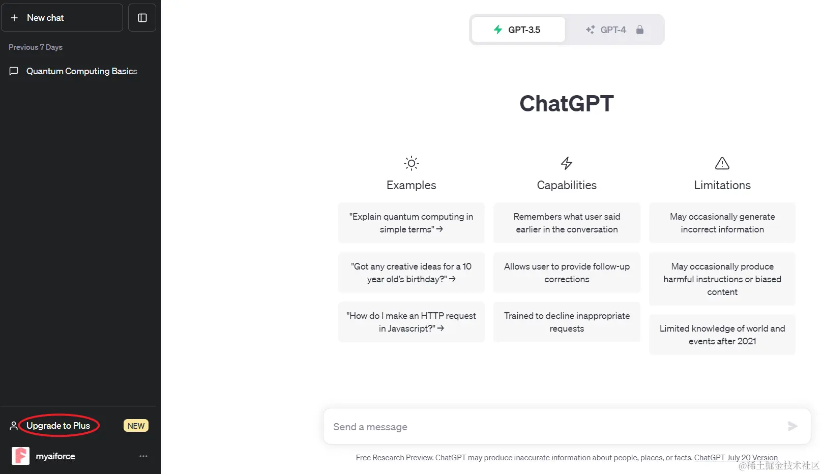 1. 访问 chat.openai.com,点击左下角的 "升级到Plus"。