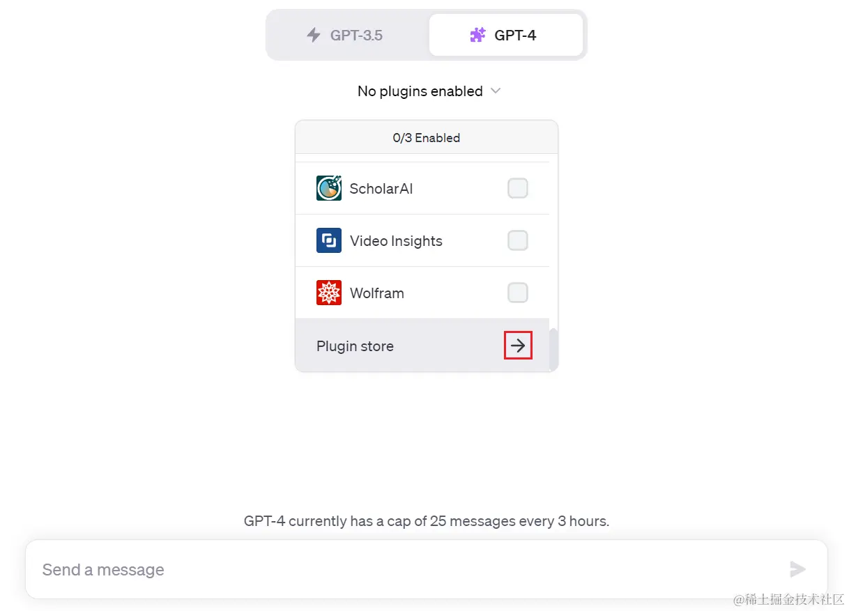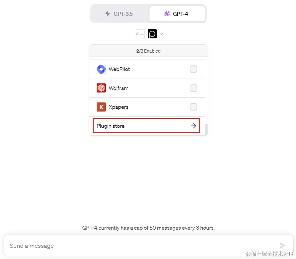 1. 在顶部的GPT-4按钮下方点击ChatGPT插件的logo,弹出所有正在使用的插件列表。滑动鼠标滚轮使列表窗口的滚动条滑至最下方,点击Plugin store,打开插件商店。