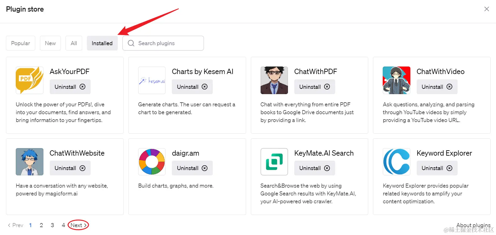 2. 在插件商店顶部的几个选项按钮中点击Installed,打开已安装的插件列表。在插件列表中寻找你要卸载的插件。如果本页没有你要卸载的插件,可以点击下方的"Next"在下一页继续寻找。