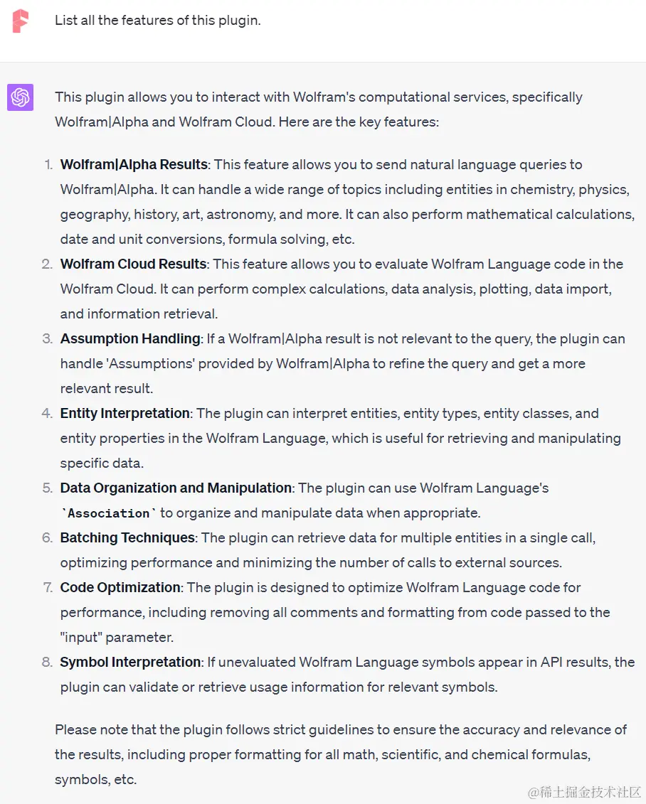 我当前选中的是Wolfram插件,ChatGPT为我列举了8个功能。