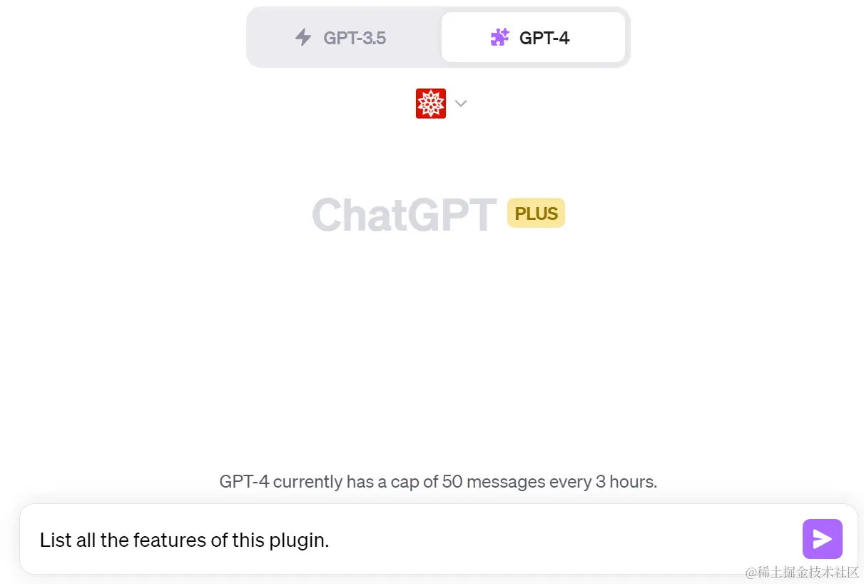 要启用插件,首先开始新的的聊天,把鼠标悬停"GPT-4"的按钮上,并在下拉菜单中选择“Plugin”。