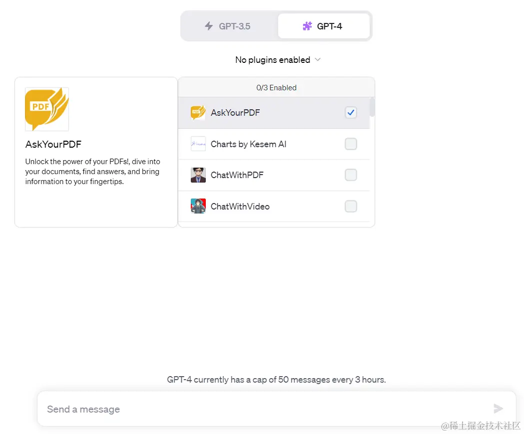 选择了"Plugin"以后,就激活了插件的功能。然后在"GPT-4"的按钮下方点击"No plugins enabled"可以打开插件列表。当你把鼠标悬停在列表里的插件时,插件左侧就可以弹出一个窗口,显示插件的logo,名称和描述。