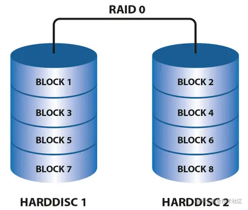 RAID0 是一种非常简单的的方式,它将多块磁盘组合在一起形成一个大容量的存储。当我们要写数据的时候,会将数据分为N份,以独立的方式实现N块磁盘的读写,那么这N份数据会同时并发的写到磁盘中,因此执行性能非常的高。