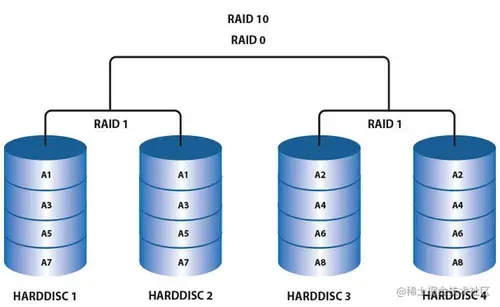 RAID10兼备了RAID1和RAID0的有优点。首先基于RAID1模式将磁盘分为2份,当要写入数据的时候,将所有的数据在两份磁盘上同时写入,相当于写了双份数据,起到了数据保障的作用。且在每一份磁盘上又会基于RAID0技术讲数据分为N份并发的读写,这样也保障了数据的效率。