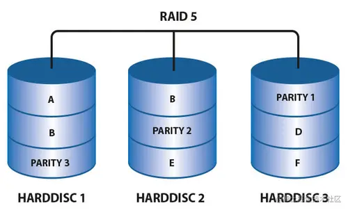 RAID5校验位算法原理:P = D1 xor D2 xor D3 … xor Dn (D1,D2,D3 … Dn为数据块,P为校验,xor为异或运算)