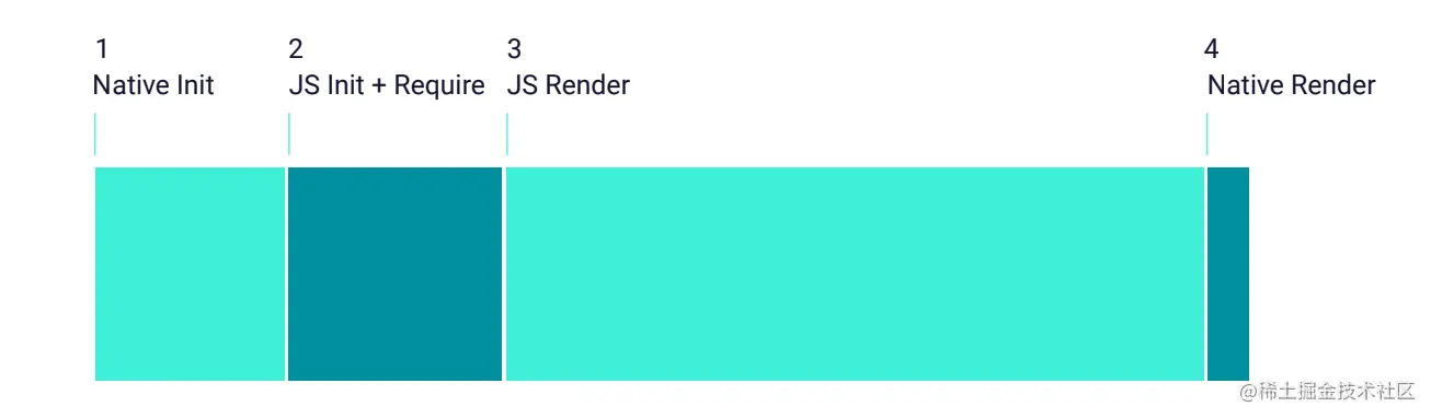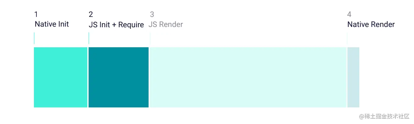 第一组涉及图中的操作 1 和 2,描述了 React Native 引导(启动虚拟机和虚拟机执行 JavaScript 代码)所需的时间。另一组包括剩余的操作 3 和 4,与您为应用程序创建的业务逻辑相关。这组操作的长度在很大程度上取决于组件的数量和应用程序的整体复杂性。