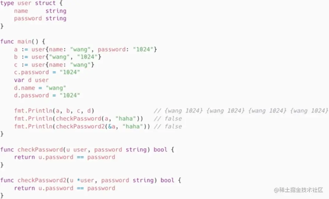 上面一小结,是将结构体本身作为参数传入,然后实现函数,这里的结构体方法,有点类似于类的成员函数,专门为结构体制定了方法,resetpassword方法实现了密码的更改,check实现了检查。