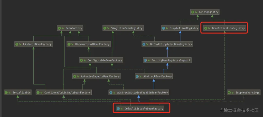 从下面这张图能够看出DefaultListableBeanFactory就实现了BeanDefinitionRegistry接口。