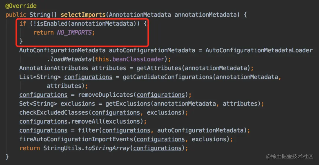 并且重写了selectImports方法,该方法会根据某些注解去找所有需要创建bean的类名,然后返回这些类名。其中在查找这些类名之前,先调用isEnabled方法,判断是否需要继续查找。