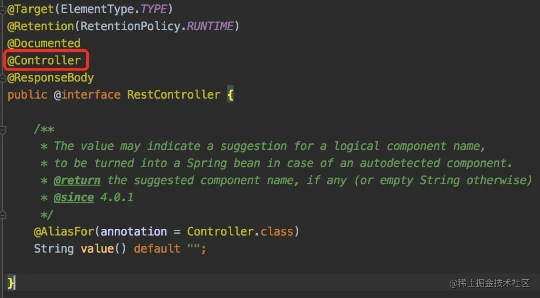 此外,除了上述四种@Component注解之外,springboot还增加了@RestController注解,它是一种特殊的@Controller注解,所以也是@Component注解。