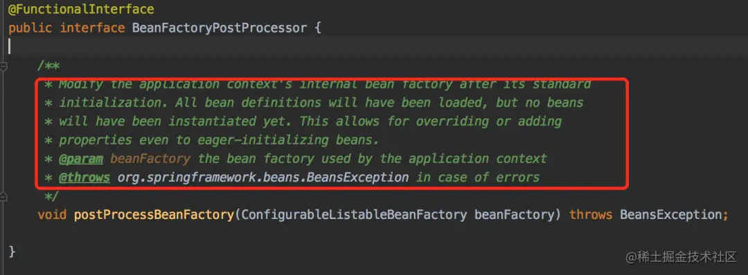 不过细心的朋友可能会发现,里面还多了一个postProcessBeanFactory方法,没有做任何实现。