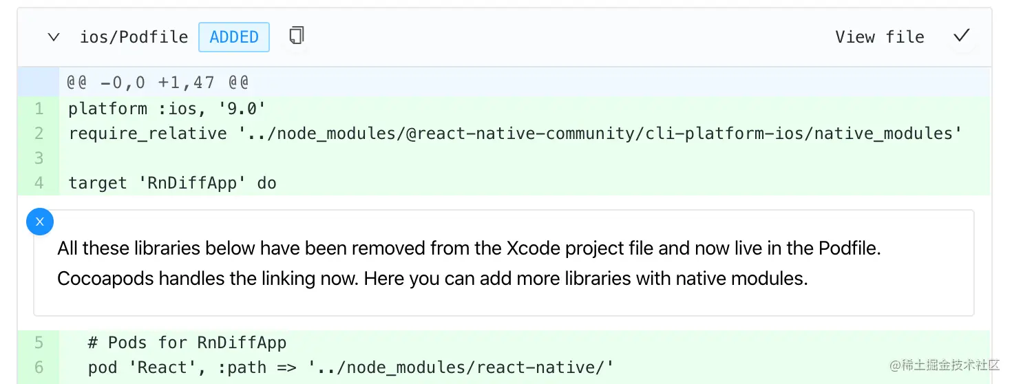 为此,该助手会比较通过运行 npx react-native init 创建的裸 React Native 项目与你的版本和你正在升级的版本。接下来,它会显示项目之间的差异,让你了解在此期间发生的每一点修改。有些修改可能会附加特殊信息注释,以提供更多背景信息,说明为什么会发生这样的事情。