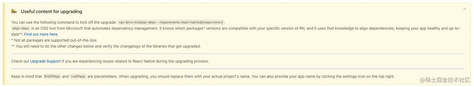 React Native Upgrade Helper 还会建议您在升级时阅读有用的内容。在大多数情况下,其中包括 React Native 博客上发布的专门博文以及原始更新日志。
