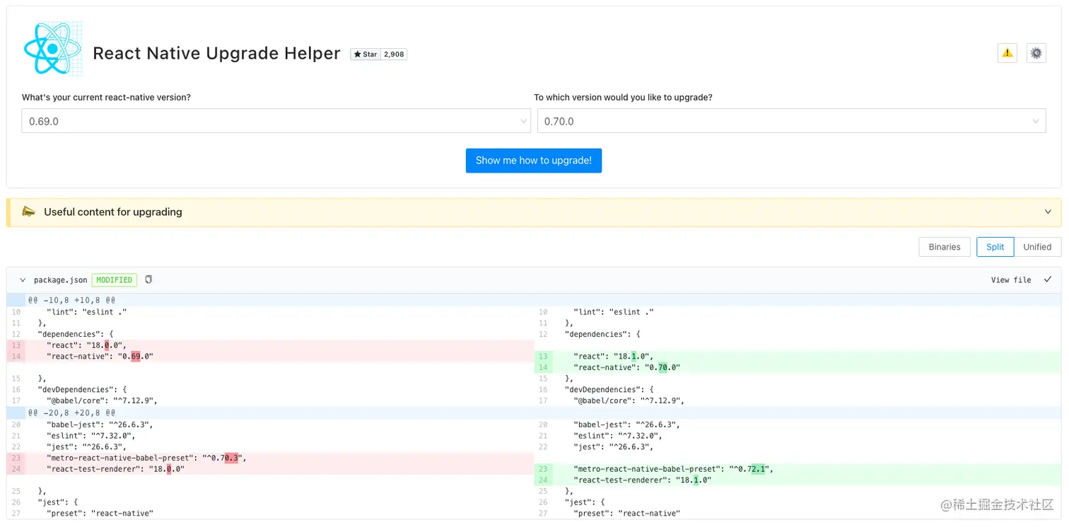 React Native Upgrade Helper是一个很好的开始。从高层次上讲,它可以让你概览自上次升级本地版本以来框架所发生的变化。