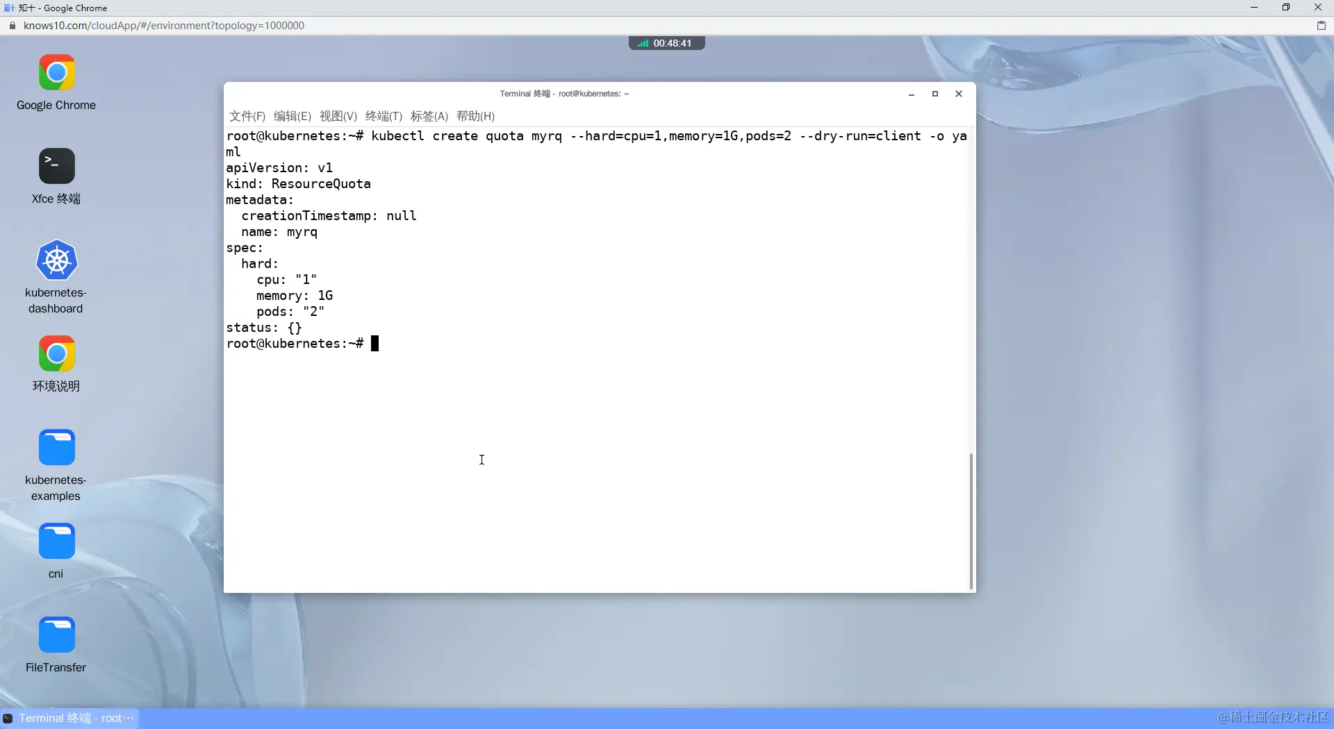 6、Get the YAML for a new ResourceQuota called 'myrq' with hard limits of 1 CPU, 1G memory and 2 pods without creating it译:获取名为'myrq'的新ResourceQuota的YAML,CPU限制为1,内存限制为1G,Pod个数为2个,而无需创建它。