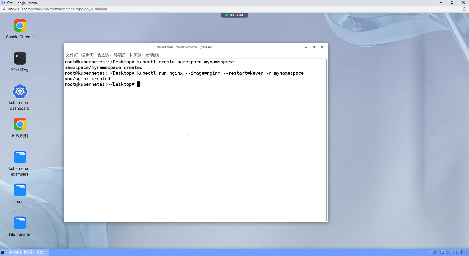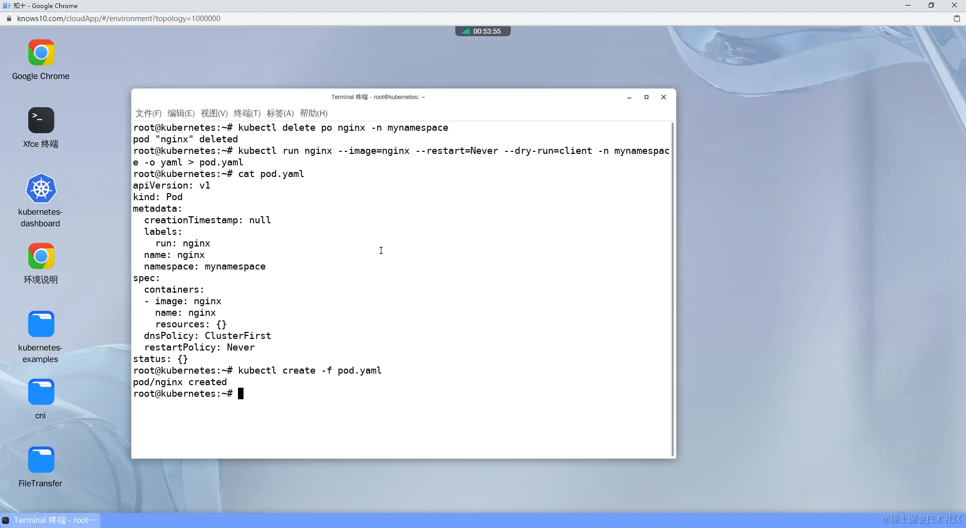 译:创建一个名为'mynamespace'的命名空间,并在此命名空间上创建一个名为nginx的pod,其中包含镜像nginx。