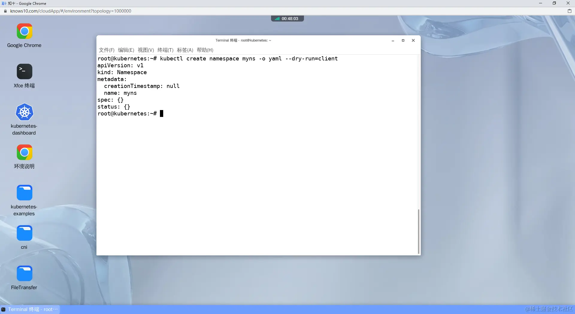 # kubectl create: 运行 kubectl 命令的基本命令部分,用于在 Kubernetes 集群中创建资源。# namespace: 要创建的资源类型,这里是命名空间。# myns: 要创建的命名空间的名称,这里是 "myns"。# -o yaml: 指定输出格式为 YAML。# --dry-run=client: 这告诉 Kubernetes 在实际创建命名空间之前只运行客户端验证,而不会真正地执行创建操作。kubectl create namespace myns -o yaml --dry-run=client