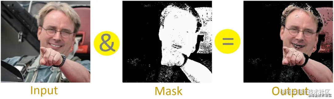 在位运算中掩码 mask 的作用一般是为了保持/更改/删除某(些)位的值,有张图非常形象(这个图可以简单的理解为,白色像素代表1,黑色像素代表0,按为与后,为1的像素位才会显示):