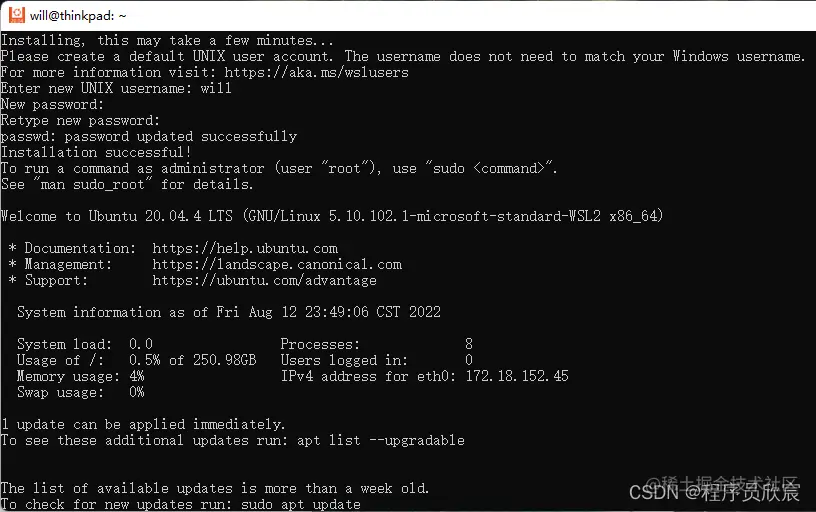 - 输入wsl --update,对WSL进行更新,等待更新完成,如下图