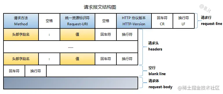 另外,HTTP请求报文和响应报文都是由开始行(对于请求消息,开始行就是请求行,对于响应消息,开始行就是状态行),消息报头(可选),空行(只有CRLF的行),消息正文(可选)组成。将在下面详细讲解。
