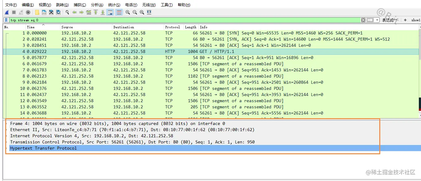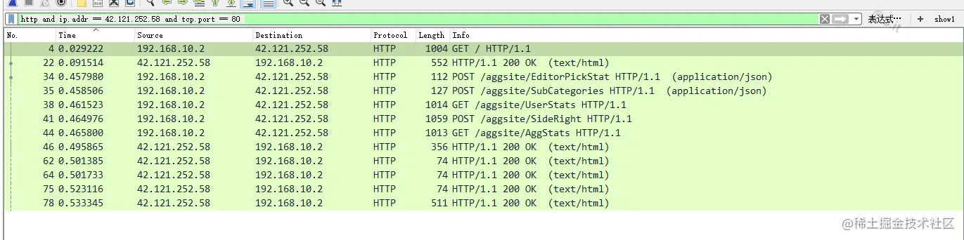 在显示过滤器中填入表达式:http and ip.addr == 42.121.252.58 and tcp.port == 80 过滤出http的响应和请求流程