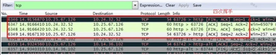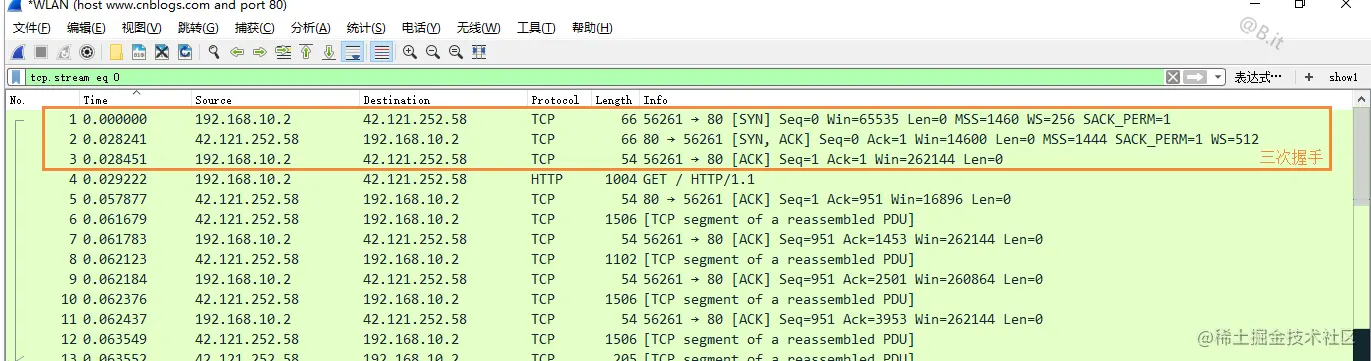 有多个TCP流时在显示过滤器中填入表达式:tcp.stream eq 0 筛选出第一个TCP流(包含完整的一次TCP连接:三次握手和四次挥手)