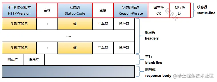 如所见,响应报文结构与请求报文结构唯一真正的区别在于第一行中用状态信息代替了请求信息。状态行(status line)通过提供一个状态码来说明所请求的资源情况。