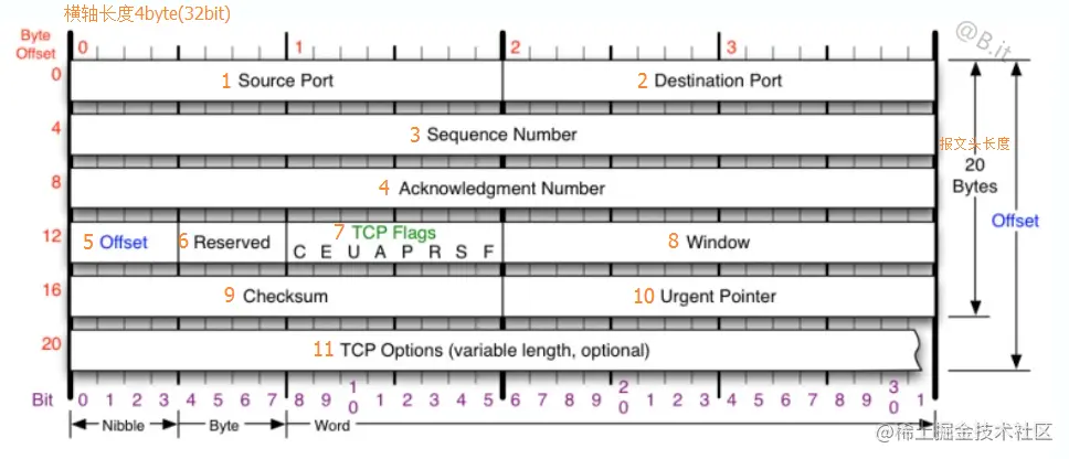 (5) Offset(TCP报文头长度):用于存储报文头中有多少个32bit(上图的一行),存储长度为4bit,最大可表示(2^3+2^2+2^1+1)32bit=60bytes的报文头。最小取值5,532bit=20bytes。