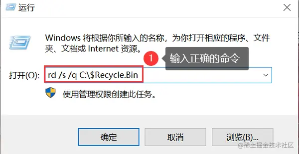 - 在命令行窗口中,输入 【rd /s /q C:$Recycle.Bin】 ,这将清空回收站中的所有文件。