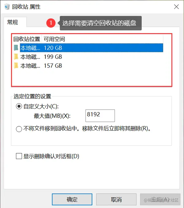 - 在 【回收站属性】 窗口中,可看到各个磁盘在回收站中的可用空间,选择需要清空回收站的磁盘;