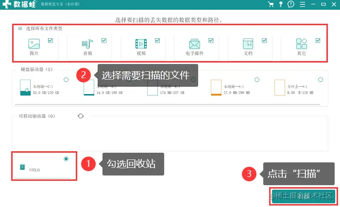 1.进入软件,勾选上 【回收站】 图标,并在文件类型处勾选需要扫描的文件,如果不确定需要恢复的文件类型,点击 【选择所有文件类型】 ,然后点击 【扫描】 ;