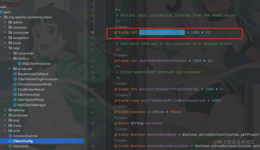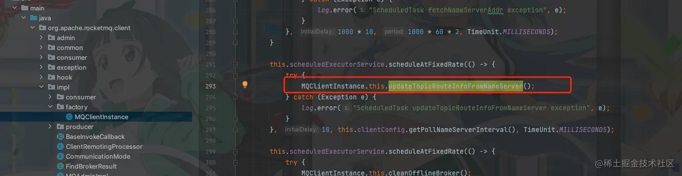 至于消费者是如何更新获取到NameServer更新的topicQueueTable,我们可以去随便看看消费者的代码