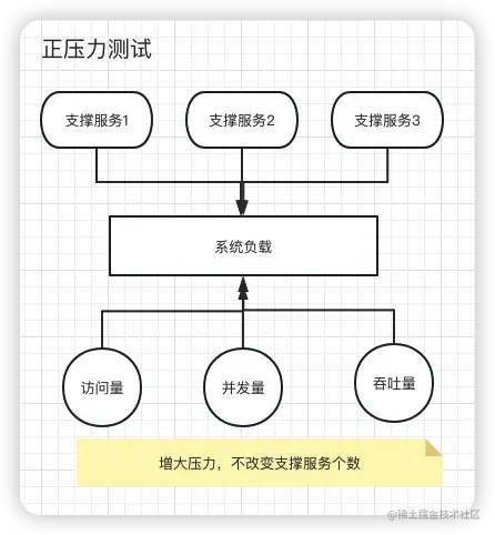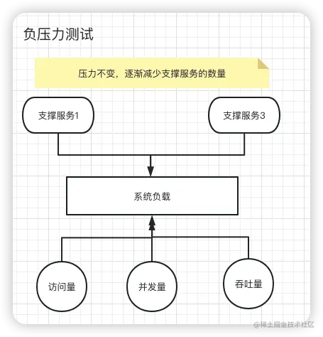 负压力测试如下图所示,也很好理解:在系统正常运行的情况下,逐渐减少支撑系统的服务器资源,观察什么时候系统无法在支撑正常的业务请求。