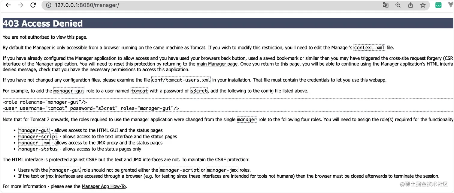 重启容器,发现还是访问不了:访问的ip地受到了限制,我们打开 /webapps/manager/META-INF/目录下context.xml文件