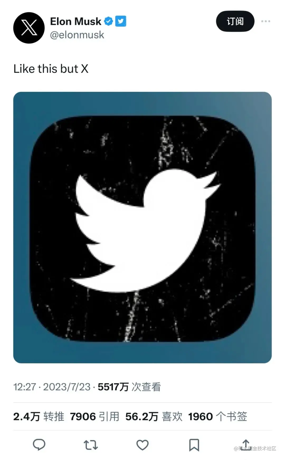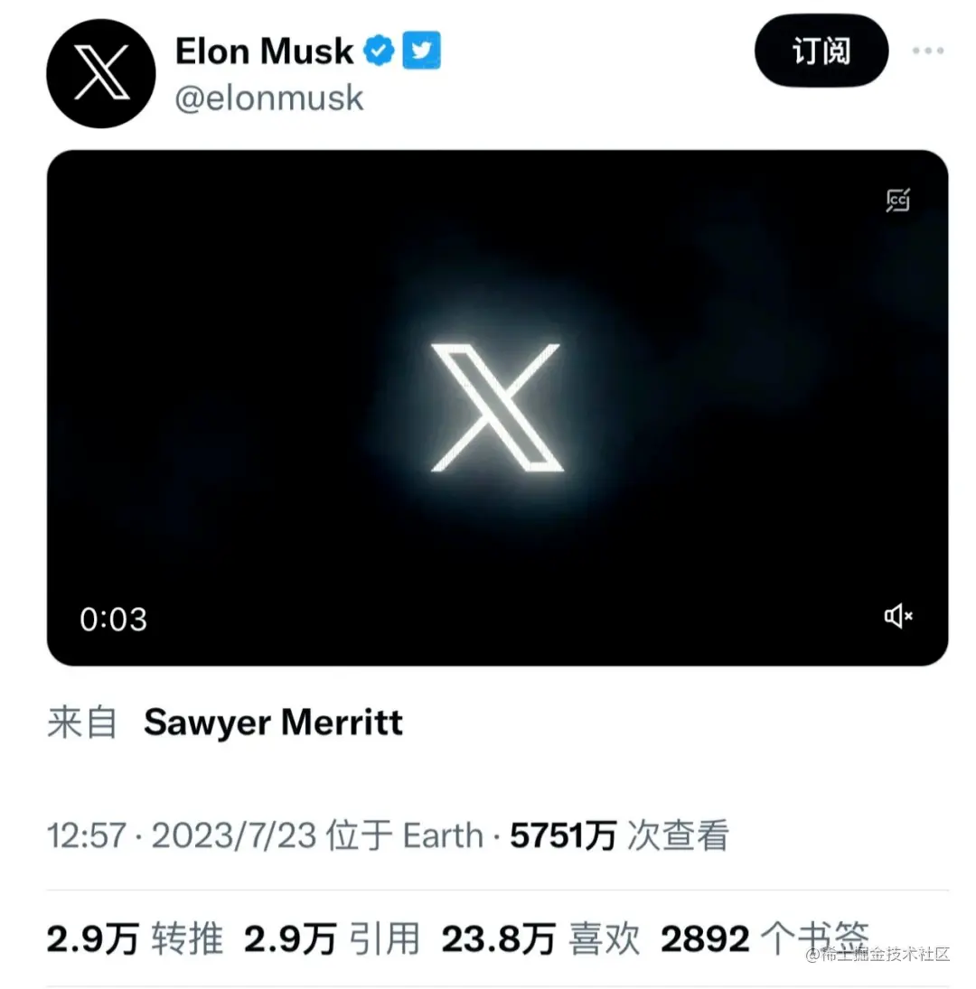 7月23日美国东部时间上午 12 点左右,Twitter 所有者马斯克在其Twitter账户上发布了一系列帖子,宣布将放弃Twitter一直以来具有代表性的蓝鸟标志,并选择「X」作为这款社交平台的全新标志。
