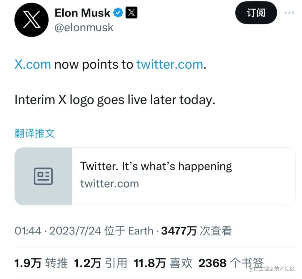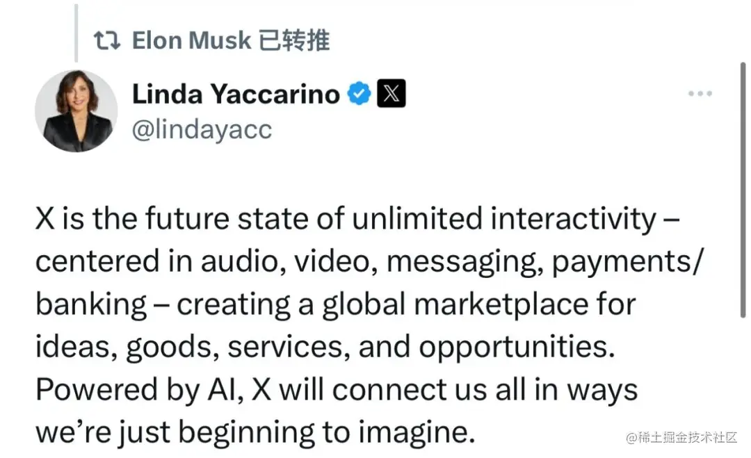 上周日下午,马斯克转载了现任 Twitter 首席执行官的琳达·亚卡里诺 (Linda Yaccarino) 对此举的看法,并给出了更加深刻的解释:“「X」 将是无限互动的未来状态——以音频、视频、消息、支付/银行为中心——为思想、商品、服务和机会创造一个全球市场。”