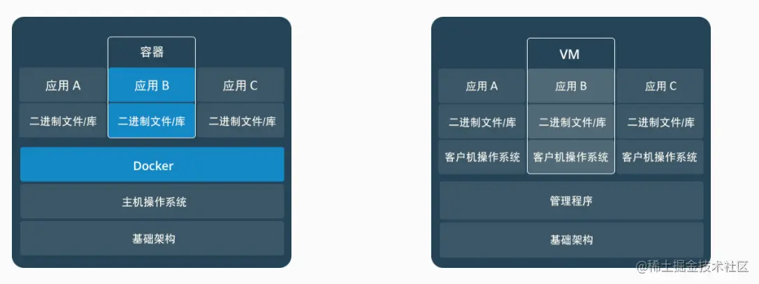 - 虚拟机 (VM) 是一个物理硬件层抽象,用于将一台服务器变成多台服务器。 管理程序允许多个 VM 在一台机器上运行。每个 VM 都包含一整套操作系统、一个或多个应用、必要的二进制文件和库资源,因此 占用大量空间 。而且 VM 启动也十分缓慢 。