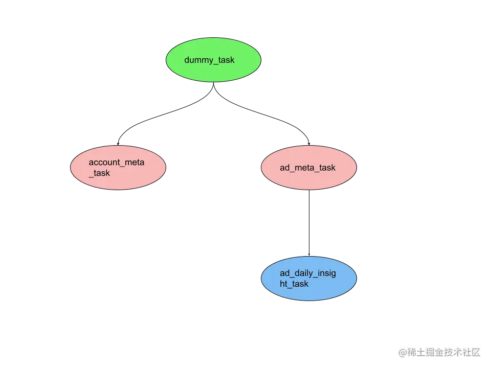 利用JSON可以组织任务的依赖关系,在如下示例中,我们定义了四个任务,第一个任务为 dummy_task,它是一个空任务,利用它组织下游的 account_meta_task 和 ad_meta_task 并列关系,这两个任务是可以并发执行的;但是对于任务 ad_daily_insight_task,则需要等待 ad_meta_task 执行完后才会执行。