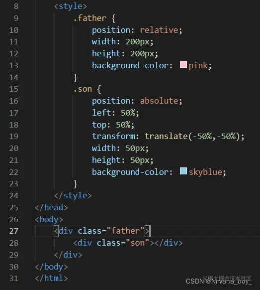 先为父盒子设置相对定位,再为子盒子设置绝对定位,且将子盒子分别向右、向下移动父盒子的一半,然后利用位移transform: translate;将子盒子分别向左、向上移动子盒子的一半。